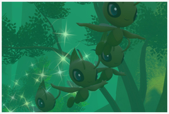 Celebi | Disponible uniquement après les crédits. Celebi apparaît dans la dernière zone et vole autour de vous en laissant parfois des traînées de lumière derrière lui. Si vous avez réussi à le toucher avec un orbe pendant son tour, il réapparaîtra sous le grand arbre où vous pouvez lui donner une pomme à manger. S'il a mangé, il se téléportera ensuite sur les ruines antiques, assis. Puis si vous lui lancez un orbe dessus, 3 de ses congénères viendront : jouez de la musique pour qu'ils se mettent à danser ! |