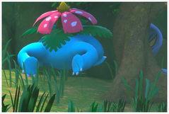 Florizarre | Quelques Florizarre traînent dans le parcours. Si vous avez attiré Arbok en face de celui qui se trouve en face du marais puis si vous avez utilisé le radar pour réveiller Florizarre, Arbok le fera fuir et vous retrouverez ce Florizarre endormi sur un rocher près de la cascade... Vous pouvez alors jouer de la mélodie pour qu'un Larméléon projette de l'eau sur Florizarre et le réveille ! Peu après, ce sont les 2 Larméléon qui arroseront à plusieurs reprises Florizarre pour le rendre joyeux... mais si vous activez la Fleur de Crysta, ils projetteront plutôt l'eau sur la face de Florizarre, ce qui l'énervera et le fera sauter dans l'eau ! |