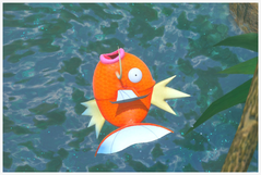 Magicarpe | Magicarpe se trouve soit dans la rivière près des ruines antiques, soit sous la cascade et peut sauter hors de l'eau si vous lancez des pommes au-dessus de lui. Un Magicarpe surpris surgit de l'eau lorsque Florizarre (s'il a été attiré ici) saute dans l'eau ! Un dernier Magicarpe est caché au-dessus de la cascade tout à droite et apparaît si vous lancez des pommes au niveau de la falaise juste à droite de cette cascade... |