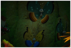 Croquine | Une multitude de Croquine sont présents dans le parcours, la plupart pouvant voler. En particulier, si vous avez joué de la mélodie, des Croquine se poseront sur la toile d'araignée de Migalos... réveillez-le en lui lançant 3 pommes dessus pour qu'il effraie les Croquine qui prendront une pose unique !! Vous pouvez aussi trouver des Croquine accompagnant Phyllali tout le long : vers la fin du parcours ils se cachent derrière la végétation mais sortent si vous activez la Fleur de Crysta et jouez de la mélodie ! Ils réalisent alors une petite acrobatie unique ! |