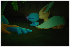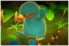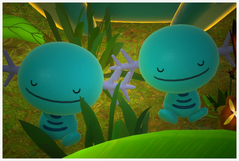 Phyllali | Phyllali court devant vous sur le chemin. Au niveau de l'intersection, si vous lui lancez une pomme dessus, il partira vers le marais où vous pouvez le stopper en réveillant les Migalos grâce à la mélodie puis il réveillera Laggron et ils pourront jouer ensemble si vous lancez un orbe sur ce dernier. Sinon il passera par le chemin de droite et croisera le chemin de Léopardus... il s'échappe par la droite par défaut, mais si vous le faites danser en jouant de la mélodie, alors les Spododo l'endormiront avec leurs spores ! Dans tous les cas, vous le revoyez dans la zone de la cascade : activez la Fleur de Crysta et jouez de la mélodie pour faire sortir les Croquine cachés et rendre heureux Phyllali ! |