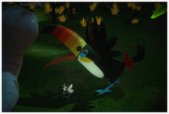 Picassaut | Un Picassaut dormant dans un tronc d'arbre juste avant le nid des Bazoucan peut être réveillé si vous jetez quelques pommes dans le tronc... il s'envole alors devant les ruines ! Si en plus, vous avez attiré Arbok du début en lui lançant une pomme dessus, il se fera effrayer par ce dernier... mais vous pouvez appeler un Bazoucan à l'aide en jouant de la mélodie !! D'autres Picassaut dorment dans le nid des Bazoucan et s'envolent pareillement que ces derniers si vous avez activé 3 fois la Fleur de Crysta du nid. Vous retrouverez ensuite les Picassaut en train de voler avec les Bazoucan près de la fin du parcours. (dans le niveau 1, vous pouvez réunir en jouant de la mélodie, des Picassaut endormis sur votre droite juste après la zone des Léopardus.) |