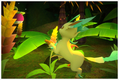 Coxyclaque | 3 Coxyclaque sont accrochés aux troncs d'arbres et imperturbables : jouez de la mélodie pour les réveiller et ils prendront leur envol ! Si vous avez réveillé les 3 Coxyclaque de la jungle (peu importe le chemin choisi) en leur ayant lancé un orbe dessus après, alors ils se réuniront derrière la cascade pour une parade unique ! Des Coxyclaque plus dociles apparaissent devant les ruines si vous activez la Fleur de Crysta devant ces mêmes ruines : nourrissez-les pour qu'ils prennent la pose ! (le comportement diffère entre le Coxyclaque au sol et ceux qui volent) |