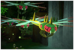 Yanmega | 2 Yanmega dorment accrochés à des branches en hauteur, vers le début du parcours. Vous pouvez les réveiller en jouant de la mélodie et ils s'envoleront pour que vous les retrouviez devant le nid des Bazoucan puis dans la zone de la cascade où ils pourchasseront les Prismillon si vous les sortez avec de la mélodie. (dans le niveau 1, au niveau de l'intersection, vous pouvez attirer un Yanmega avec de la mélodie puis le faire à nouveau pour qu'il vienne se battre contre les Migalos sur le chemin du marais, et dans ce cas, si vous activez la Fleur de Crysta sur le rocher juste sous la cascade, un essaim de Yanmega apparaîtra !) |