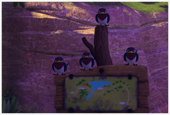 Couaneton | Les Couaneton se situent tous au niveau de la mer. Ils acceptent les pommes que vous leur lancez. De plus, vous pouvez apercevoir deux Couaneton en train de voler dans le ciel : l'un est sur la gauche de la route et l'autre arrive de la mer en faisant un virage au niveau de la route pour atterrir brutalement dans la mer auprès des autres Couaneton et Lakmécygne. |