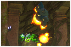 Cryptéro | Vous verrez Cryptéro d'abord dans la deuxième salle où il vole en retrait et peut tirer des lasers s'il est touché par une pomme. Après lui avoir lancé une pomme, il s'envolera jusqu'à la troisième salle (il se trouve sur votre gauche en arrivant) : si vous lui lancez une pomme dessus une seconde fois ici, il appellera des Golemastoc ! Enfin, vous verrez un Cryptéro dans la dernière salle, dans un coin en hauteur : si vous activez le radar, il se mettra à tirer des lasers et un deuxième Cryptéro apparaîtra : ils peuvent réaliser une acrobatie dans les airs si vous jouez de la mélodie. |
