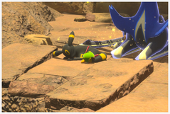 Blancoton | Des Blancoton traînent dans la troisième salle (avec le lac) : un seul se tient sur un débris alors que les autres volent près du coin. Ce premier s'envolera près des ruines antiques si vous avez rétabli Xerneas assez tôt pour qu'il fasse son saut. |