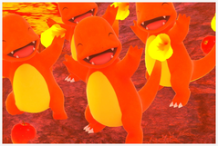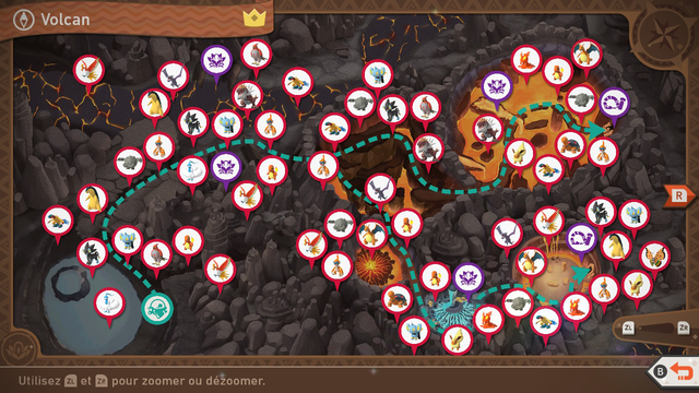 Salamèche | Vous apercevrez Salamèche à plusieurs reprises sur les montagnes. Celui que vous croisez avant d'entrer dans la grotte fait face à Aéroptéryx : si vous lui lancez un orbe dessus, il crachera exceptionnellement du feu pour remporter le combat ! Dans la salle finale (lave rouge) au fond, vous croiserez 3 Salamèche, mais vous pouvez en attirer pour en réunir 8 au maximumVous devez avoir activé la Fleur de Crysta près du Salamèche dans la seconde zone après le début du parcours, sinon seuls 7 Salamèche peuvent se réunir ici. en lançant des pommes dans la crevasse. Si en plus, vous avez activé la Fleur de Crysta au dessus du Rexillius énervé et que vous avez attiré au moins 5 Salamèche, jouez de la mélodie pour qu'ils se mettent à appeler Dracaufeu ! Avant d'entrer dans la grotte de lave bleue, 2 Salamèche traînent sur un sol volcanique : lancez-leur un orbe dessus puis faites tomber Gravalanch pour faire apparaître Dracaufeu ! Enfin, le Salamèche de la grotte de lave bleue voudra bien manger vos pommes et il brûlera même la pomme la seconde fois que vous lui donnez ! |