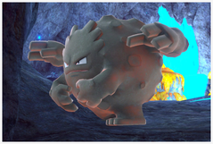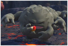 Gravalanch | En sortant de la première zone, vous verrez 3 Gravalanch dévaler la pente en roulant : si vous leur lancez un orbe dessus, ils rateront le virage et se cogneront, ce qui arrête la course du Rexillius venant chasser les Aéroptéryx. Ils pourront manger vos pommes ici, et ils utilisent parfois leurs petits bras (uniquement après les crédits) ! De plus, en rentrant dans la grotte (chemin classique), vous verrez 3 Gravalanch sont accrochés au mur : pour deux d'entre eux, si vous leur lancez une pomme dessus, ils tomberont puis pourront manger vos pommes ! Un autre Gravalanch est trouvable dans la salle finale de lave, où il s'accroche éperdument à un pilier : si vous lui lancez une pomme suffisamment tôt, il tombe puis il s'en va en roulant ! Un Gravalanch est accroché en hauteur du cratère juste avant l'entrée de la grotte de lave bleue et tombe si vous lui lancez une pomme dessus ! Enfin, un dernier dans la grotte de lave bleue se nourrit de débris... vous pouvez le faire déplacer en lui lançant une pomme dessus ! |