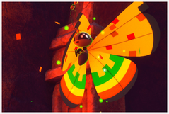Flambusard | Quelques Flambusard volent très haut dans le ciel dans ce parcours. Il y a notamment un Flambusard posé sur un rocher dans la deuxième zone qui peut attraper une de vos pommes lancées sur le sol fissuré, s'il n'y a pas de Rexillius à proximité ! Sinon, deux autres Flambusard se trouvent sur une plateforme au-dessus du Rexillius endormi : le second apparaît si vous jouez de la mélodie. Ils peuvent ouvrir leurs ailes si vous utilisez le radar et l'un peut même voler vers la salle de lave rouge si vous lui lancez une pomme dessus (ou si vous réveillez Rexillius via Chimpenfeu). Dans cette dernière salle, Flambusard pourra manger vos pommes. |