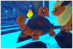 Typhlosion | Vous trouverez un premier Typhlosion dans la partie du début de parcours : il se tient sur une falaise devant vous et gronde : lancez-lui une pomme dessus pour qu'il aille se frotter à un Ptéra dans la seconde zone... aidez-le en lui lançant un orbe pour qu'il déclenche une éruption !! Les 2 derniers se trouvent au niveau des ruines, après la grotte de lave bleue : ils peuvent fuir si vous leur lancez les pommes directement dessus mais acceptent de manger si elles sont lancées à côté... Après vous être approché, les Typhlosion brûleront les pommes si vous les leur lancez dessus ! Ils peuvent même faire face à un Dracaufeu si vous l'avez invoqué juste avant la grotte de lave bleue ! |
