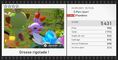 | Autres Pokémon | Plus les autres Pokémon occupent de la place sur la photo, plus cette note sera élevée. Les points sont plus importants si les autres Pokémon ont une interaction avec le sujet. | - |