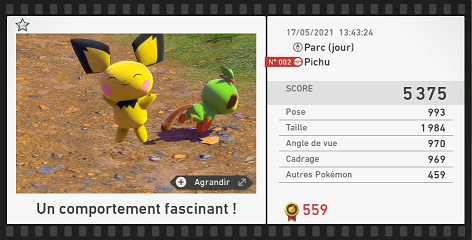 Le professeur évalue vos photos en fonction de la posture du Pokémon, la place qu'il prend dans l'image, s'il est tourné vers vous ou pas, ou encore sa position dans le cadre. Gardez toujours à l'esprit que plus le Pokémon photographié est en entier et centré dans le cadre, plus vous aurez de chances d'avoir une bonne note. La présence d'autres Pokémon et la qualité des environnements sur vos clichés peuvent également impacter le score que vous obtenez. Vous pouvez seulement prendre 72 photos par exploration (si jamais cette limite est atteinte, le niveau prendra fin si ce n'est pas votre première exploration).Un score et un palier sont donc attribués à chacun de vos clichés !