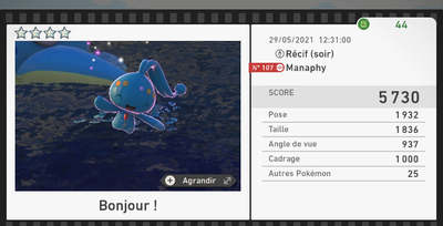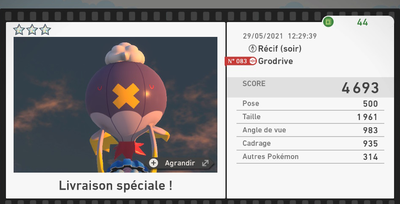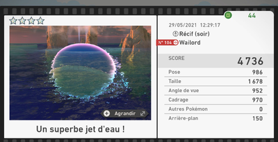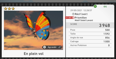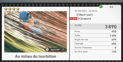 Le nombre d'étoiles des photos n'a aucune influence sur le score de parcours.Par exemple, une photo 1★ à 4500 points vaudra davantage pour le score de parcours qu'une photo 4★ à 3000 points.
