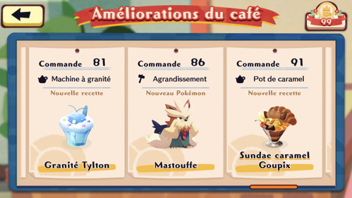 En progressant dans votre aventure, vous pouvez obtenir tout un tas d'améliorations pour votre café. Il existe 2 sortes : les agrandissements qui vous permettent d'étendre votre café et obtenir plus de clients et les décorations qui vous permettent de débloquer certains Pokémon qui serait potentiellement intéressés à visiter votre café ou de nouvelles recettes du Menu de votre café.