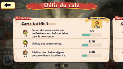 Comme dans de nombreux jeux, Pokémon Café Mix vous propose divers défis que vous pouvez retrouver sur cette page. Si vous relevez avec brio les défis d'une carte, vous recevrez une récompense encore plus importante.