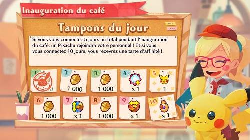 Lorsque vous commencez à jouer, vous tamponnez d'abord la carte "Inauguration du café" possédant 10 récompenses dont un Pikachu à recruter !