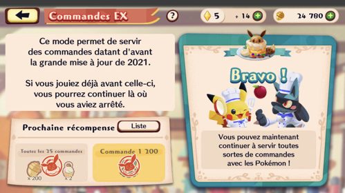 Dans Pokémon Café ReMix, en plus du mode Commandes de base, il existe un autre mode appelé "Commandes EX" qui vous permet de servir des commandes datant d'avant la grande mise à jour de 2021. Si vous jouiez déjà avant celle-ci, vous pourrez continuer là où vous aviez arrêté.