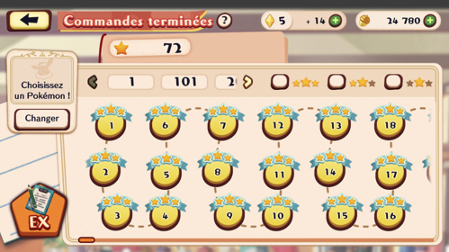 Préparez des commandes avec différents Pokémon pour gagner des points d'expérience et augmenter leur niveau.Vous pouvez choisir jusqu'à 4 clients à servir par commande (2 emplacements par défaut, 1 achetable pour 5000 glands dorés et 1 obtenable via le Pass premium).