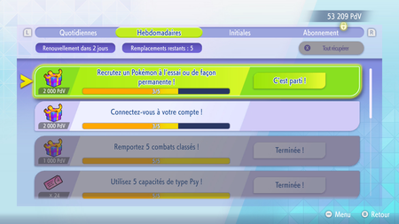 Les missions hebdomadaires, qui sont réinitialisées tous les lundis.