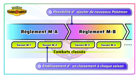 Les saisons durent un certain temps, durant lequel vous essayez d'atteindre le classement le plus élevé. À la fin de chaque saison, votre rang est enregistré, et vous en obtenez un nouveau en fonction de vos performances. Vous obtenez également de nouvelles récompenses.Les règlements déterminent les Pokémon autorisés ainsi que certaines règles en combat. En fonction des règlements, de nouveaux Pokémon peuvent être ajoutés ou retirés.