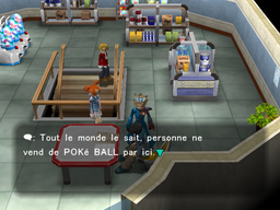 Votre amie vous propose d'aller acheter des Poké Ball. Comme vous avez pu le constater, la boutique n'en vend malheureusement pas. Allez-y quand même, et parlez à la personne assise sur une chaise à l'étage pour savoir où en trouver.