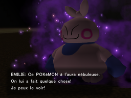 Note : vous allez avoir affaire à votre premier Pokémon Obscur. Le but du jeu étant de tous les récupérer et les purifier, vous devez voir ces Pokémon comme des Pokémon sauvages. À vous de les affaiblir suffisamment pour pouvoir les capturer.