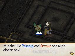 Encore une fois, vigilance ! Arceus possède l'attaque Jugement qui frappe en carré sur les 6 cases qui l'entourent et qui inflige un maximum de dégâts. D'autant plus que seul le Pokémon lié à vous (à savoir Evoli ou l'une de ses évolutions, Phyllali pour ma part) peut prétendre à la liaison !