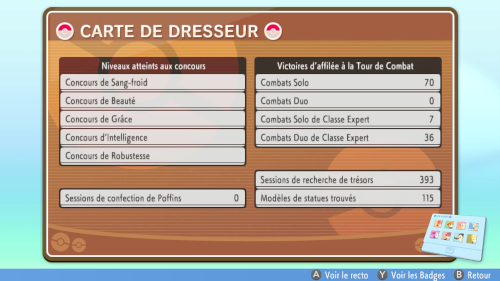Au verso de votre Carte, sont affichés vos records dans les Super Show Concours et à la Tour de Combat. Vous pouvez aussi voir votre nombre de sessions de confection de Poffins et de recherche de trésors dans les Grands Souterrains.