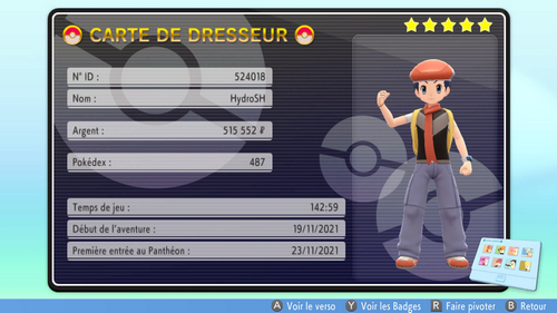 Pokémon Diamant Étincelant et Perle Scintillante possèdent à nouveau un menu Carte de Dresseur ! Ce menu affiche de nombreuses informations sur votre progression, comme votre argent ou votre ID de Dresseur, et marque certains hauts faits avec des Étoiles.