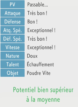 Statistique Valeur de l'IV Pas top 0 Passable 1 à 15 Bon 16 à 25 Très bon 26 à 29 Fantastique 30 Exceptionnel 31 Remarque globale Valeur totale des IV Potentiel correct 0 à 90 Potentiel supérieur à la moyenne 91 à 120 Potentiel bien supérieur à la moyenne 121 à 150 Potentiel exceptionnel 151 à 186