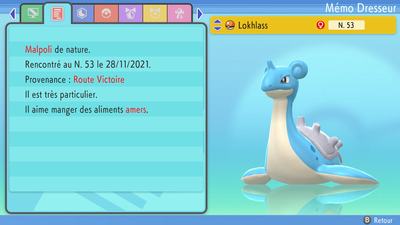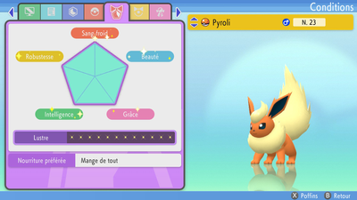 Donner un Poffin à vos Pokémon augmente leurs conditions de concours consultables dans leur résumé. Optimiser leurs goût et qualité est absolument nécessaire pour gagner un maximum de points dans les Super Show Concours, notamment en rang Master. Cela est aussi nécessaire pour faire évoluer votre Barpau (170 de Beauté).Vous pouvez voir qu'une catégorie est au maximum quand elle brille.