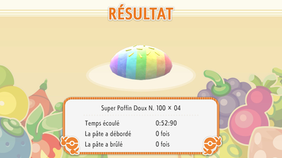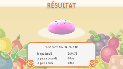 Le Poffin terminé, vous verrez alors l'écran de résultat s'afficher. Vous pourrez enfin vous rendre compte de l'efficacité de votre pétrissage. Le tableau vous présente le temps de préparation, le niveau et le type du Poffin qui a été produit.
