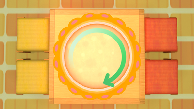 Puis, faites des cercles sur l'écran avec les joysticks, dans le sens indiqué. Attention : si vous tournez dans le mauvais sens, cela accroît le temps de la préparation (celui-ci change plusieurs fois pendant le mélange). Vous devez donc changer de sens aussi vite que possible pour cuisiner rapidement.
