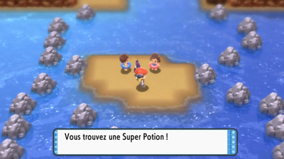 Entamez votre petite excursion sur la Route 219 puis atterrissez sur un premier îlot où vous pouvez récupérer une Super Potion (cachée dans le sable) et battre deux dresseurs (en solo ou duo).