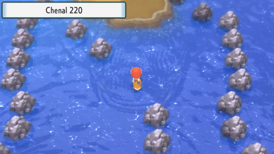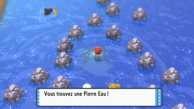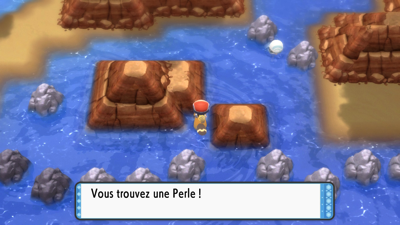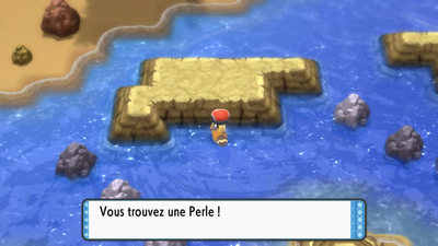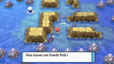 Dirigez-vous à l'est pour vaincre les trois derniers dresseurs (dont 2 en solo ou duo) puis récupérez une Grande Perle (cachée sur le rocher le plus au sud) ainsi qu'une Pierre Eau sur l'îlot.