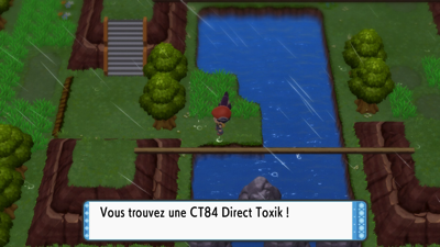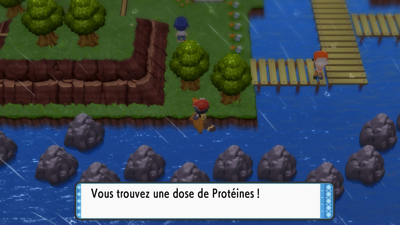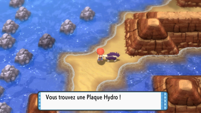 Une Huile (visible au sol), une Plaque Hydro (visible au sol), une Perle (cachée entre deux petits monts) et un Carbone (visible sur l'eau) sont à ramasser et deux dresseurs peuvent être affrontés en solo ou en duo.