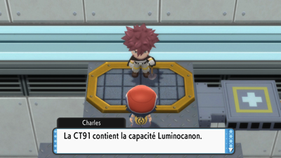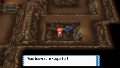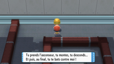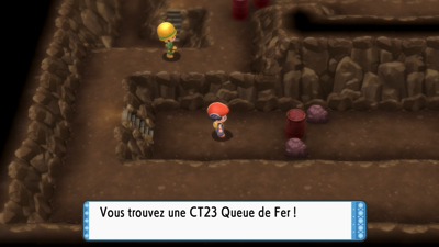 Prenez l'ascenseur et passez par les escaliers de droite où deux dresseurs peuvent être combattus et où vous pouvez aussi récupérer une Huile Max, la CT23 Queue de Fer, ainsi qu'un Fer (caché près de la CT).