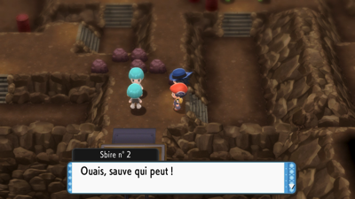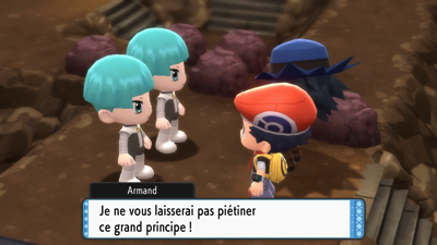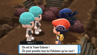En progressant vers le sud, vous arriverez devant deux sbires de la Team Galaxie, responsables de l'agitation des Pokémon des lieux selon Armand. Très arrogants, vous décidez de leur infliger une bonne correction.