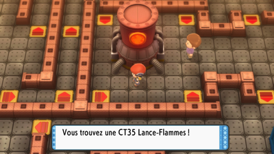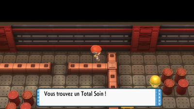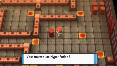Récupérez aussi un Total Soin (caché contre un mur) puis revenez sur vos pas et prenez cette fois la dalle fléchée juste en-dessous de celle qui vous a permis de récupérer l'Anti-Brûle, pour atterrir à côté d'un autre dresseur. Prenez la dalle fléchée juste-au-dessus de ce dernier, puis prenez-en une autre qui vous fera buter contre un baril (sur lequel vous pouvez récupérer une Hyper Potion cachée).
