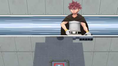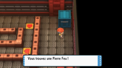 Récupérez une Pierre Feu au nord-ouest, près d'un conteneur. Prenez la seule dalle fléchée qui vous fait avancer vers le sud, puis celle du haut (lorsque 3 sont disponibles pour progresser) pour tomber sur un dernier dresseur. Récupérez aussi l'Encens Roc en évitant toutes les dalles fléchées au sol.