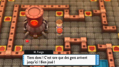 Continuez en prenant la dalle à l'extrême sud pour arriver devant M. Fuego, qui vous remet une Pierre Feu pour avoir réussi à explorer toute la forge. Devant le fourneau, vous pouvez également ramasser la CT35 Lance-Flammes puis sortir.