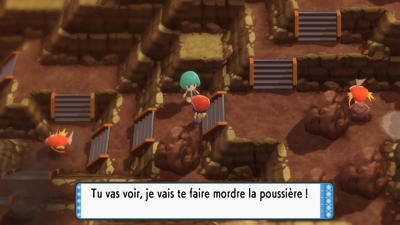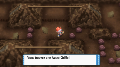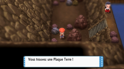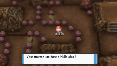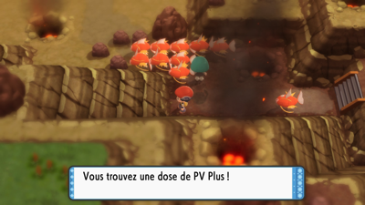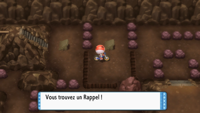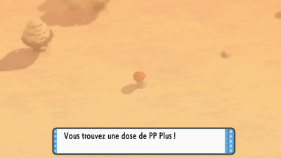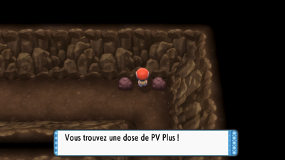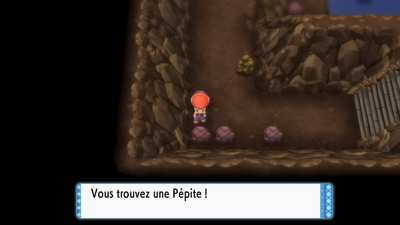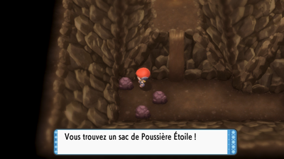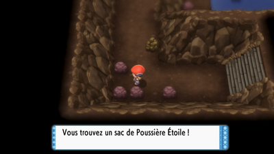 Récupérez ensuite un Super Bonbon en débloquant un chemin, parsemé de deux rochers. Descendez ensuite au sous-sol et utilisez Anti-Brume pour dissiper le brouillard, puis récupérez une Poussière Étoile et une Pépite (cachée dans le rocher juste à côté). Descendez les marches et allez au nord pour récupérer un PP Plus (caché dans le mur tout au nord).