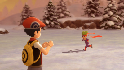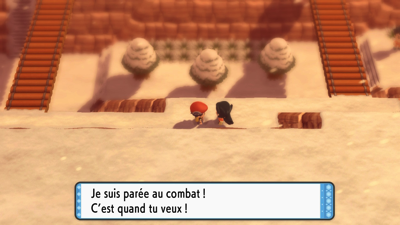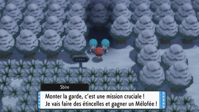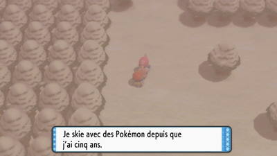 Commencez par battre un premier dresseur puis continuez jusqu'à une autre dresseuse et récupérez une Pépite (cachée près des arbres). Partez ensuite vers l'est et récupérez un PP Plus (caché dans la neige) tout en combattant un dresseur.