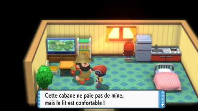 Traversez le deuxième pont pour combattre un premier dresseur. Rebroussez chemin et continuez tout en combattant les dresseurs qui vous font face. Un peu plus loin, vous tomberez sur la Cabane enneigée où vous pouvez vous reposer et requinquer votre équipe.