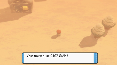 Continuez au nord pour attaquer la deuxième partie de la route. Récupérez un Fer au sol ainsi que la CT07 Grêle un peu plus loin et une Protéine (en-dessous de la CT, cachée dans la neige).