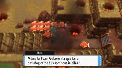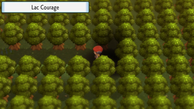 Pénétrez le lac pour y retrouver la Team Galaxie qui semble avoir réussi à endommager sévèrement les lieux à l'aide d'une bombe, ce qui a eu pour effet d'assécher le lac et de rendre visibles des Magicarpe qui ne sont plus en mesure de nager paisiblement et qui sont donc affaiblis... Quelques sbires vous défieront lors de votre progression jusqu'à la Caverne Courage.