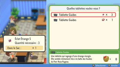 En parlant à la première jeune femme au comptoir, vous pouvez échanger des Éclats Étranges contre des Tablettes Guides, et la deuxième vous permet d'acheter des objets (Balls, Médicaments...). En effet, en obtenant des Tablettes, vous pouvez les poser dans les Salles du Parc et ainsi capturer certains Pokémon Légendaires. Nous vous renvoyons à notre guide complet sur le Parc Rosa Rugosa pour que vous puissiez obtenir tous les Pokémon Légendaires s'y trouvant et ainsi compléter votre Pokédex.