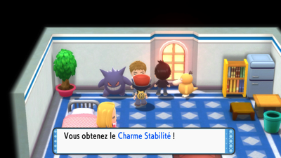 En route pour la Rive du Lac Courage (en passant par Verchamps) ! De là, entrez dans la maison au nord-ouest. En parlant au réalisateur du jeu (celui avec un Ectoplasma), vous obtiendrez le Charme Stabilité (sous réserve que votre Pokédex régional soit complet). Une fois le Pokédex national rempli, n'oubliez pas de revenir le voir pour qu'il vous remette le fameux Charme Chroma. L'autre réalisateur (celui avec un Psykokwak) vous remet un diplôme attestant que vous avez rencontré tous les Pokémon de la région de Sinnoh au moins une fois.