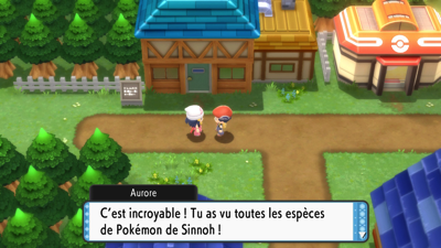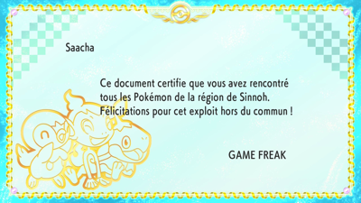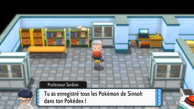 Envolez-vous pour Littorella où vous retrouvez l'assistant(e) du Professeur Sorbier devant son laboratoire. À la vue de votre Pokédex qui est désormais complet, il/elle vous conseille d'aller le montrer au professeur. Entrez donc et allez lui parler pour qu'il vous félicite d'avoir enregistré tous les Pokémon de Sinnoh dans votre Pokédex.